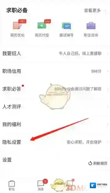 1、打开猎聘app后进入我的个人中心,将屏幕往下拉找到隐私设置选项