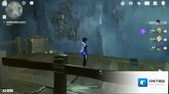 跳下矿洞,在通道横着的石柱上拍下古代生物照片三
