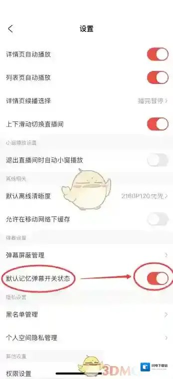 3、打开默认记忆弹幕开关状态右侧开关即可。