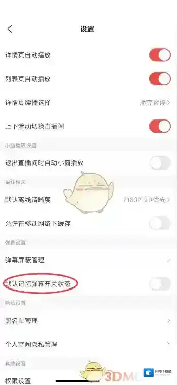 2、在设置页面,找到并点击默认记忆弹幕开关状态。