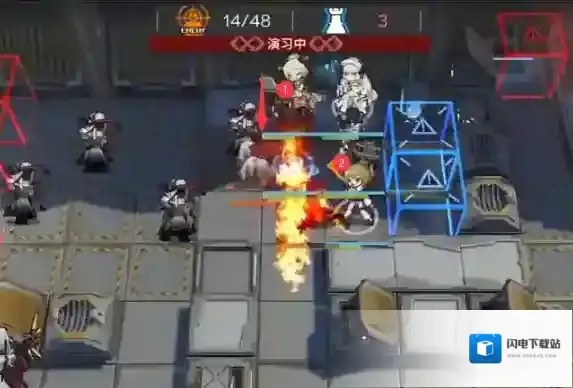 如下图所示顺序位置部署:推进之王(能打的先锋) → 德克萨斯(常规先锋) → 煌(向下) → 夜莺(向下)。干员朝向如下图所示。