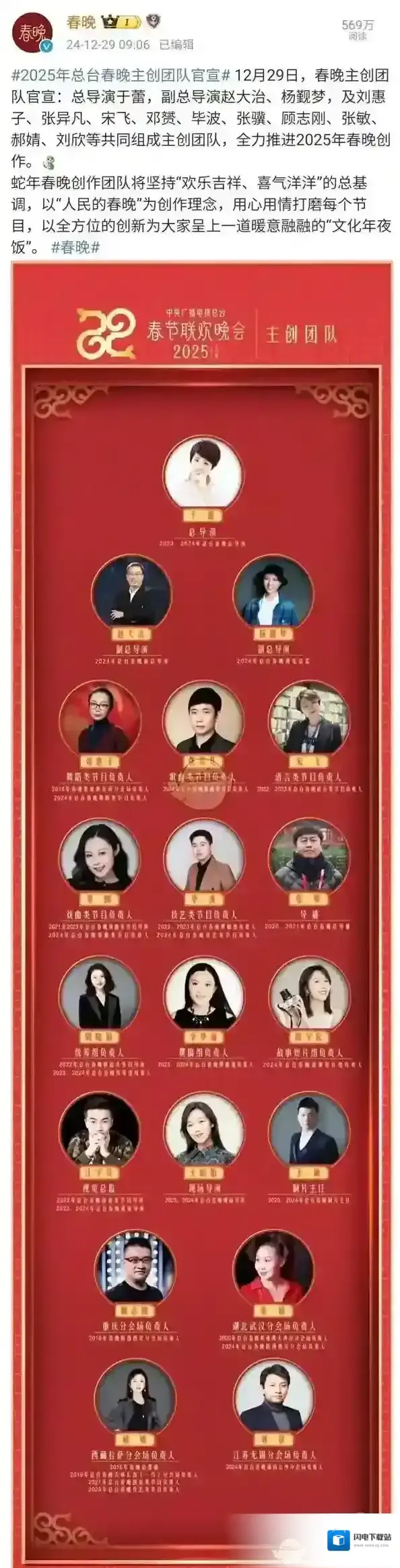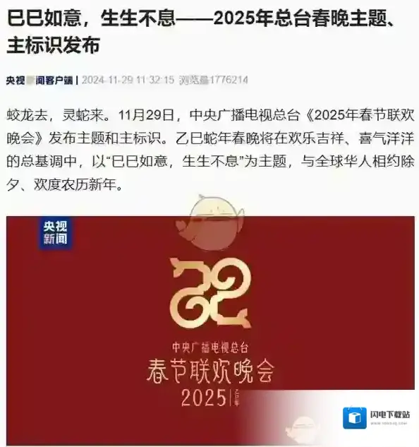 2025年央视春晚的主题为“巳巳如意,生生不息”,创作团队将延续“欢乐吉祥、喜气洋洋”的基调,用心打造每一个节目,为观众献上一道独特的“文化年夜饭”。