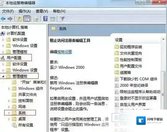 3、这时候我们可以在右侧窗口中找到阻止访问注册表编辑工具项;