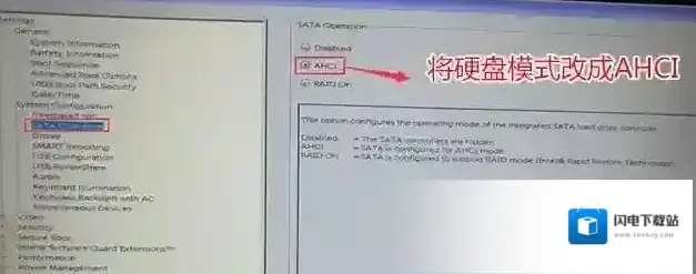 5、注意:切换到system configuration项,如果硬盘模式是raid,将sata operatior硬盘模式改为ahci模式,否则安装win7会同现0x0000007b蓝屏,改了后选择退出并保存BIOS,如下图所示;