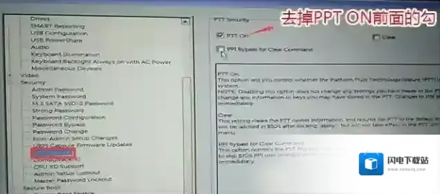 注:戴尔笔记本每做一步BIOS更改记得应用一下2、切换到切换到sercurity将ppt sercurity右侧PPT ON前面的勾去掉,如下图所示;