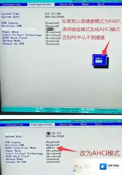 6、注意:再返回configuration这项,查看sata controller mode这项,如果默认硬盘模式为RAID,请将硬盘模式改为AHCI模式,否则进PE后不能认出硬盘,如果更改后记得按F10保存,如下图所示;