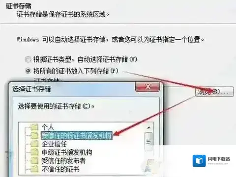 4、在“证书导入向导”窗口中我们选择第二项“将所有的证书放入下列储存”再单击“浏览”选择“受信任的根证书颁发机构”点击确定