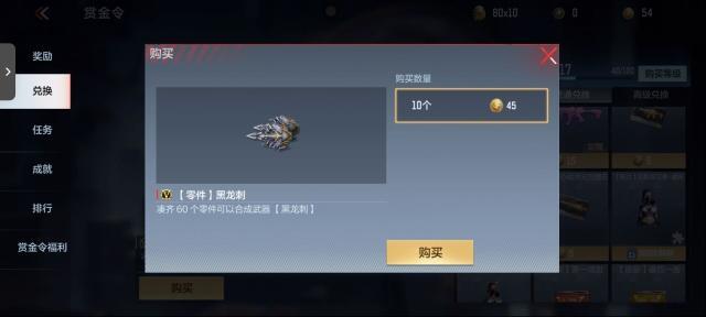 手感方面黑龙刺整体刀身修长,因此上手手感十分轻盈,挥刀时的红色刀痕光效极具打击感,并且目前的指刺类武器全部恢复成与端游一般的打击音效,因此该武器更加容易上手,搭配超快的轻击攻速,稍加练习即可大杀四方!获得方式黑龙刺目前返场在了赏金令兑换商城中,价格为45赏金币兑换10零件,凑齐60零件即可合成,价格十分亲民,60零件共需270赏金币。