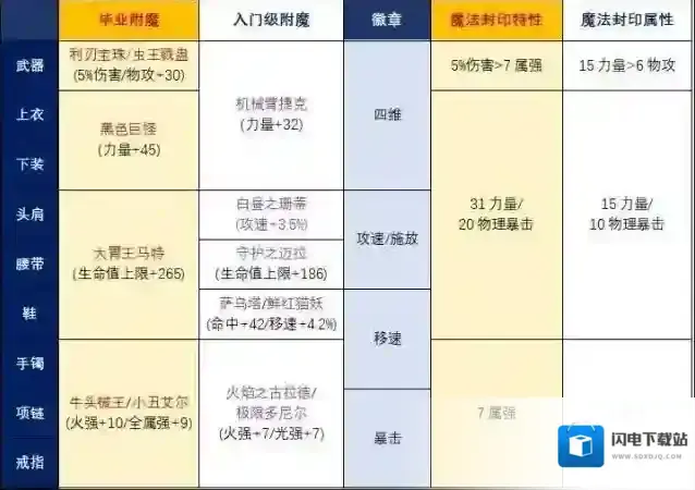 一觉被动加成的是高额的暴击伤害,因此魔法封印部分属性也可以考虑选择堆暴击。拓展抓取技能炙烤和踏射,抓取后自身无敌,用于破霸体、读条型技能,对迷妄之塔30层的寒冰人偶师有奇效。但要注意这类技能对建筑固定型敌人无效,如虫王戮蛊、世界领主石巨人、罗特斯等。拓展特性技能优先加大技能。强化-碉堡轰炸、强化-压缩量子炮、强化-踏射。无黑钻时,可以加强化-激光炮和强化-量子爆弹。打造属强推荐走火或光中的一个。技能篇中有提到光热反应,这里不再赘述。徽章/魔法封印/附魔徽章优先都升到5级,普通的徽章每天都可以从商城处花金币进行购入。