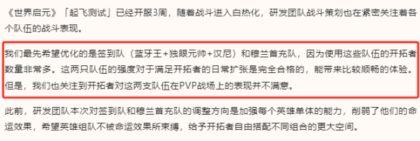 在《世界启元》有一支签到就可以免费获取的签到队伍,测试中的无数战报表明,这支签到队伍拥有足以和大佬的队伍掰掰手腕的强劲实力,并且,游戏还在此前的一份公告中表示,后续会对这支签到队伍进一步加强,摆明了愿意为平民玩家考虑的态度。有这么一支队伍存在,即使你不用游戏赠送的所有金币和抽卡资源,也能获得良好的游戏体验。