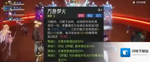 她的大招叫做万象梦火,这个技能使用的时候,她先会做出一个攻击上升的增益,并且是给全体的队友都带来两个回合提升的之后,还有一个增益是额外的触发效果,是给敌方的全体带来一个4段的连击伤害,这里4段造成的伤害是65%的数值,而且四段当中,每一次的攻击都会有30%的概率,可以附加给敌人一个梦魇的影响效果,后期她在潜能上面如果得到基础属性提升的话,还可以给自己的攻击、防御以及生命数值都提升5%的提升,所以有潜能效果的时候,她自身的能力会更好用。