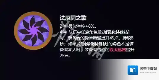 2、4件:队伍中任意角色发动[强化特殊技]时,装备者的异常精通提升45点,持续8秒,如果发动强化特殊技]的角色不是装备者本人时,装备者造成的以太伤害提升25%。