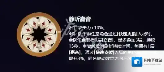4件套:队伍中任意角色通过[快速支援]入场时,全队角色获得1层[嘉音],最多叠加3层,持续15秒,重复触发时刷新持续时间,每拥有1层嘉音],通过[快速支援]入场的角色造成的伤害提升8%,同名被动效果之间不可叠加。