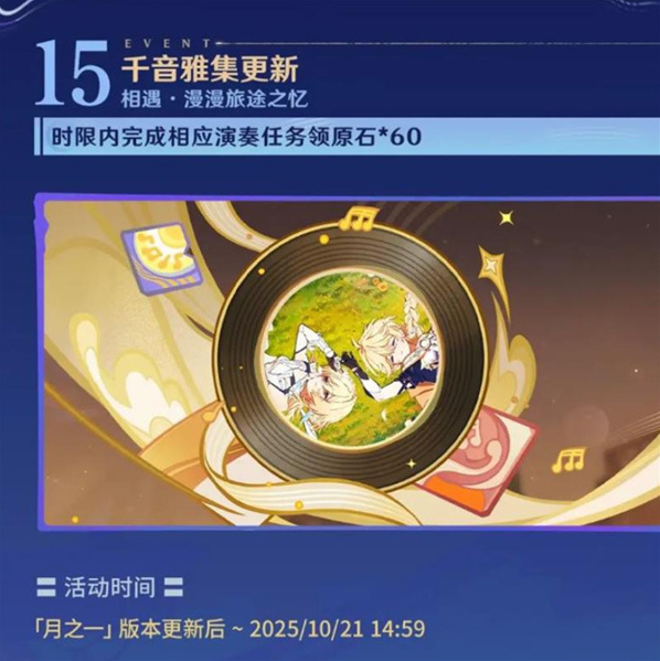 千音雅集更新(至10月21日14:59):新增专辑,完成演奏任务奖励原石*60