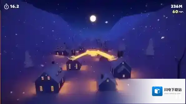 雪夜飞行是一款采用全3D引擎打造的沉浸式飞行冒险作品,玩家将化身为雪夜中的飞鸟,在月光浸染的雪原上空自由翱翔,以绚丽的光影特效描绘飘落的雪花、闪烁的星光与皑皑雪原,玩家需操控鸟儿躲避旋转的风车、突降的暴雪等动态障碍,同时收集散布在空中的荧光能量球,雪粒撞击羽翼的粒子特效与呼啸的风声营造出身临其境的飞行体验。