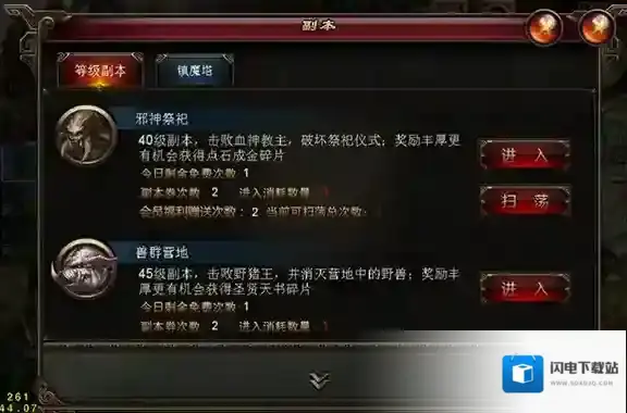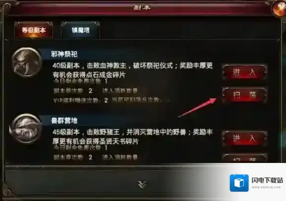 ⑤镇魔塔:前期后期主要获得经验方法之一。于副本一样,每日一次免费机会,购买副本卷轴课额外增加2次机会。开通青铜VIP可额外增加1次机会。开通黄金VIP额外赠送2次机会。