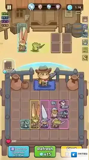 2、进入关卡后玩家可以将初始伙伴放入背包,相同的伙伴可以合并提升等级,点击refresh可以获得新的伙伴。