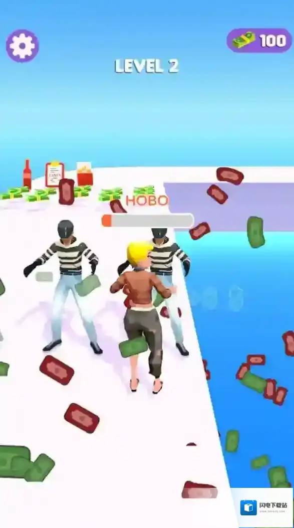 2、在LEVEL2,于满是金钱、酒瓶场景,躲避条纹衣敌人,朝着“HOBO”进度条方向,收集财富推进。