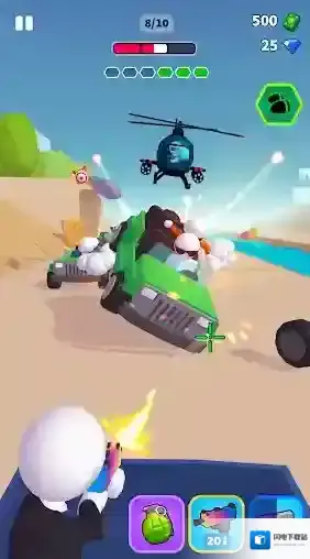 街口枪战(Rage Road),一款十分魔性有趣的射击闯关类小游戏。运用了3D卡通风格进行打造,无论是场景还是人物看上去都十分的舒适,搭配上精彩刺激的射击玩法,让玩家能够获得最畅快解压的游戏体验!不仅如此,游戏内还有着丰富的汽车模型和人物皮肤,让你可以用最具个性的外观参与挑战!