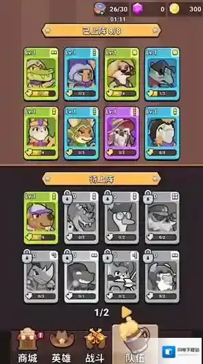 2、进入关卡后玩家可以选择初始英雄进行战斗,相同品质的英雄可以合并来提升等级。
