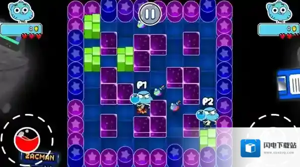 2、进入关卡后玩家滑动左边屏幕可以控制角色移动,角色只会沿着直线前进,右下方是放置水炸弹按钮。