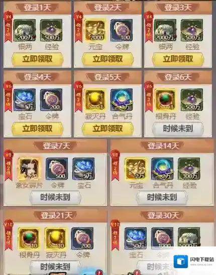 每日登录,根据登录天数领取各式奖励,VIP用户更能得到双倍福利。登陆30天后,即可收获50万宝石、1000令牌和5000万银两的丰盛奖励,助你在江湖中蓄力飞跃!