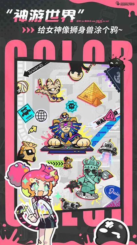 环游世界,探索女神像、法老地宫等知名景点,与景点元素产生神奇交互,将导弹、小黑喵等元素转化为涂色素材,解锁专属关卡与彩蛋。
