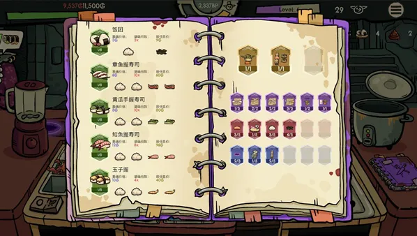 5、每制作一个寿司以及完成一个订单就会获得经验,提升等级后可以选择一项升级来强化你的寿司获得食材。