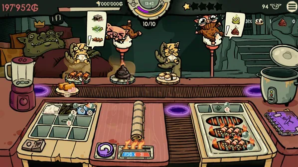 哥布林寿司是一款创意模拟游戏,你经营一家为哥布林等奇幻种族服务的寿司店。每完成订单积累经验升级后,你将从随机出现的三张卡牌中选择其一,这些卡牌直接代表新的寿司食谱、稀有食材、厨房设备或特殊效果。