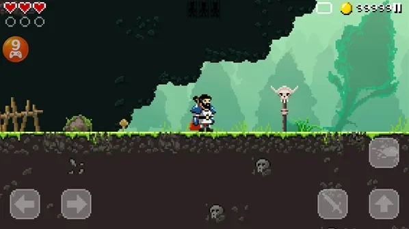在像素风格的场景里操控勇士,使用武器攻击蜗牛之类的敌人,探索标有问号的木牌所在区域,收集金币。