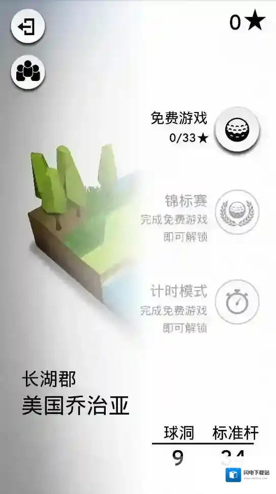 1、模式选择主界面有“免费游戏”“锦标赛”“计时模式”,需完成免费游戏0/33★解锁其他模式,场景为“长湖郡美国乔治亚”。