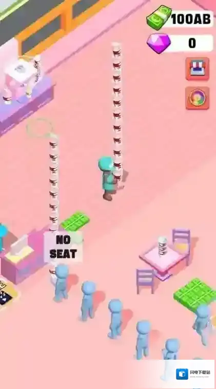1、显示NOSEAT角色、货币(100AB)、钻石等元素,属于休闲益智的解压,玩法是经营餐厅、安排顾客就座等。
