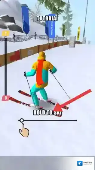 1、在TUTORIAL阶段,长按屏幕HOLD TO SKI,控制滑雪者在雪道滑行,熟悉操作。