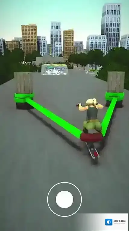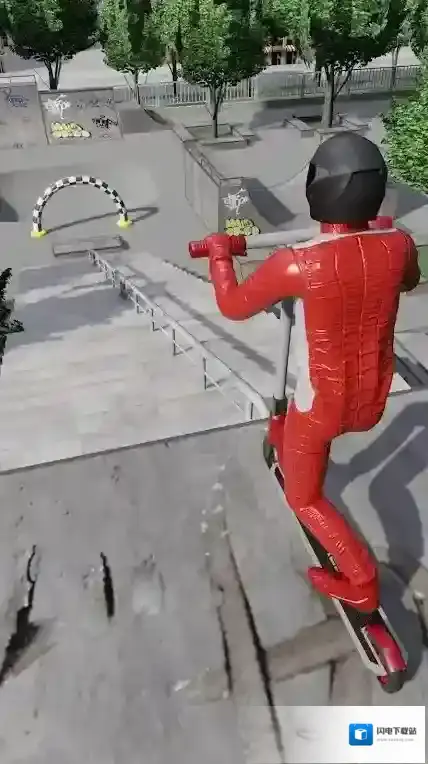 1、操控红色滑板车角色,从坡道出发,沿箭头冲下台阶,挑战特技。