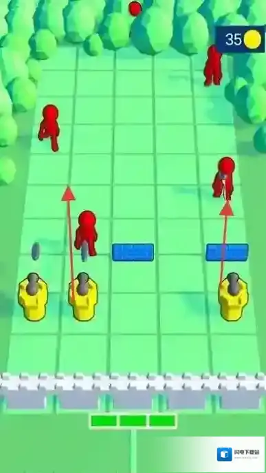 1、“布置防御塔”,在阵地放置黄色防御塔,自动攻击红色敌人,阻挡进攻路径。