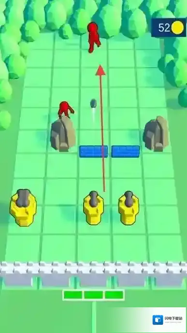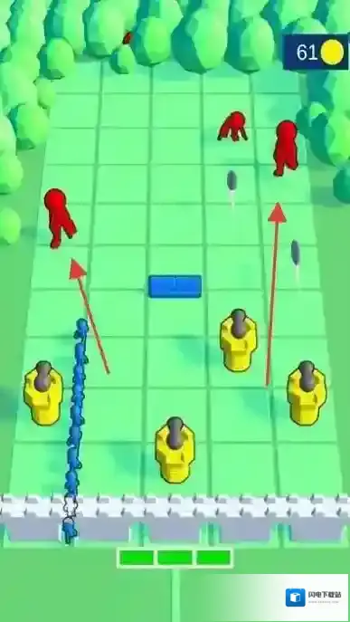 3、“抵御敌人”,红色敌人沿路径推进,防御塔与蓝色士兵合力攻击,守护阵地,完成关卡。