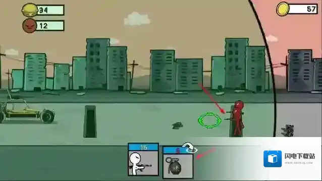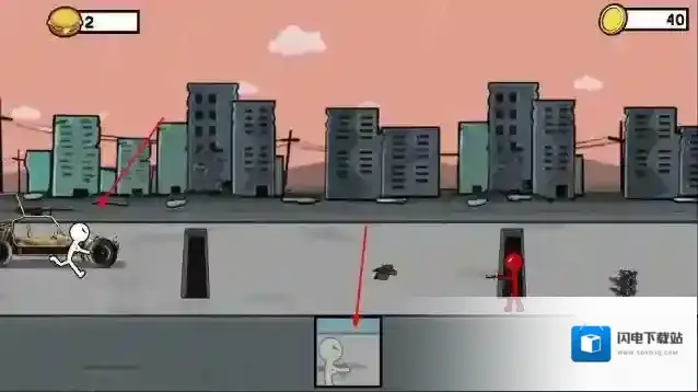 1、“操控移动”,控制白色火柴人,在城市废墟场景移动,躲避障碍(汽车、路障)。