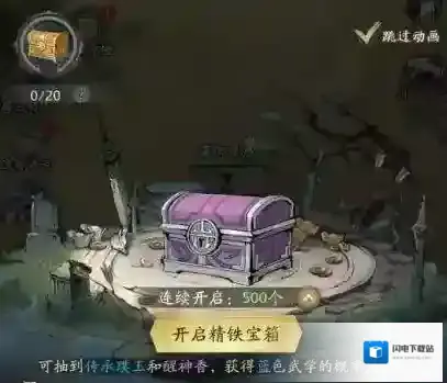 3、江湖宝箱,木质-精铁-黄铜-鎏金-珐琅,宝箱的等级越高开出的武学和奖励越好,同时会累计积分,达到目标后可以领取累积奖励。