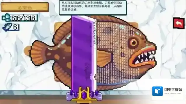 3、拟真鱼类处理系统,钓获的鱼类需要进行刮鳞,去内脏等专业处理,游戏详细展示了不同鱼类的处理技巧。