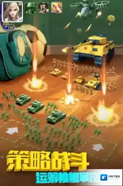 2、战斗界面,利用策略指挥部队(如士兵、坦克),按箭头方向推进,掌控战局,获取胜利。