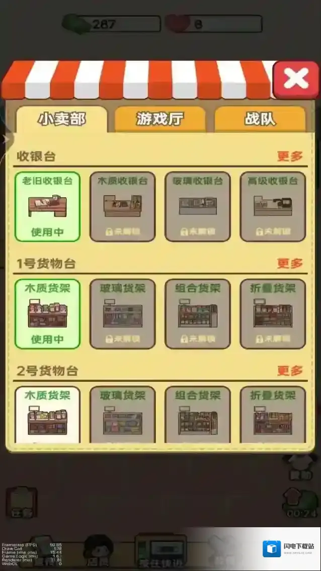 3、进入装修界面,优先使用“老旧收银台”“木质货架”,积累资源后解锁高级设施,优化店铺布局。