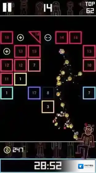 3、冲排名续存挑战:目标是进入前十名,需持续打破砖块并保持生存,通过不断挑战提升成绩,借助物理引擎带来的真实反弹效果,在突破关卡中向更高排名迈进。