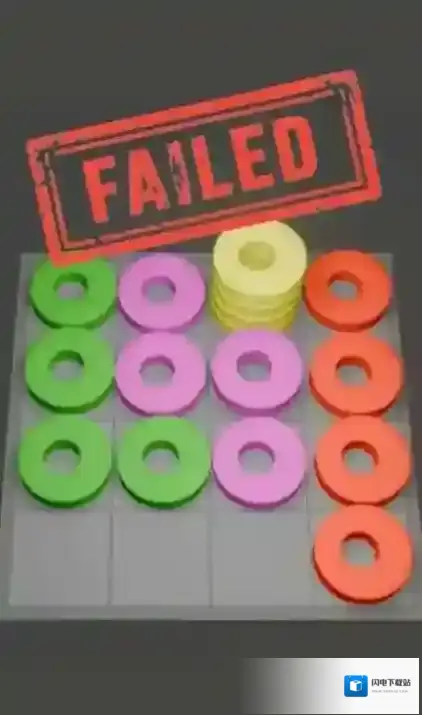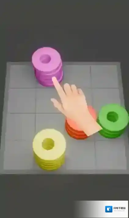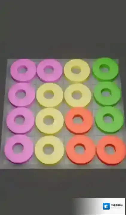 3、第三关出现红、蓝、绿、黄多种颜色圆环,优先处理箭头指向的蓝色圆环,将其精准移到蓝色专属列,按颜色分类归位,使所有圆环各就其位,顺利通关。