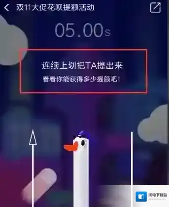 4,这个游戏的游戏规则就是用力把这个戴着帽子的小鹅给提出来,成功的话就能获得一定的花呗额度,当然这个有几率,也会有不成功的时候哦,共有10次提额机会,每轮有5秒的时间。