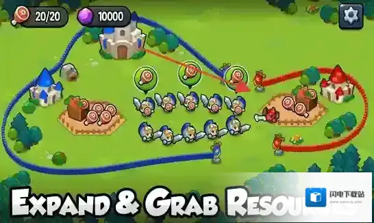 1、“资源抢占”,指挥部队沿路径扩张,占领资源点(食物堆),积累资源(宝石、食物)。