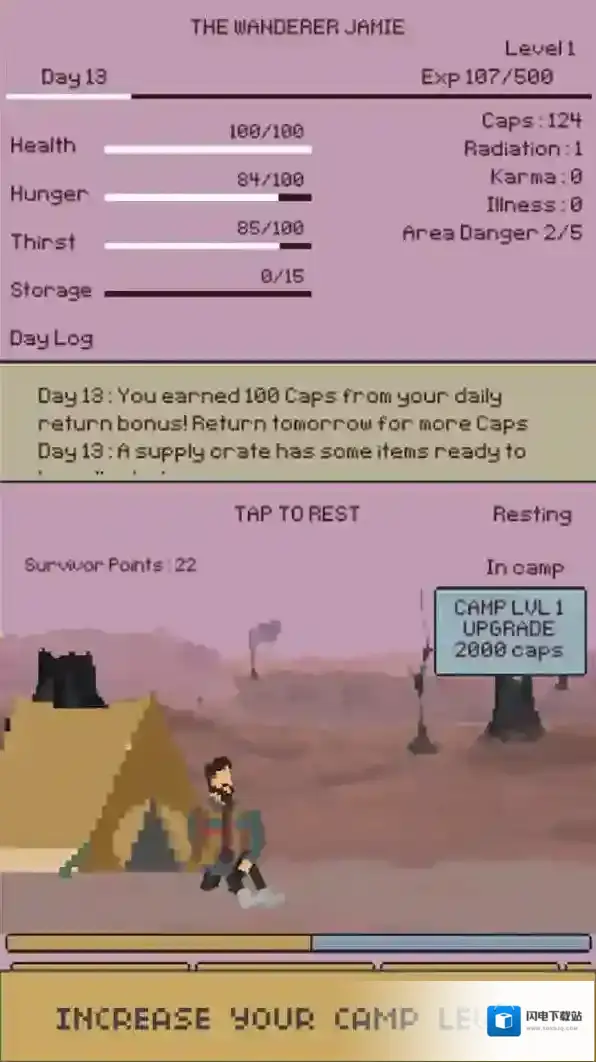 3、在营地,点击休息到第二天,恢复状态,推进Day1进程,积累Survivor-Points,发展角色。