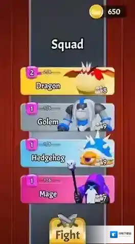1、“部队编排”,在Squad界面,选择Dragon、Golem等兵种,搭配出战小队,消耗金币强化。