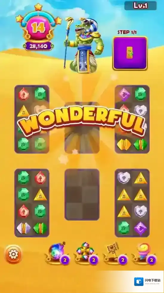 1、埃及风格设计:消除元素融入金字塔、法老面具等古埃及符号,背景画面呈现沙漠、神庙等场景,浓郁的异域风格让视觉体验独特,沉浸感十足。