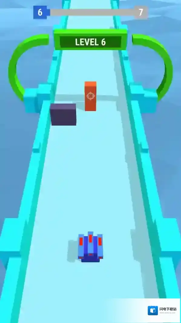2、推进到Level6,观察红色箭头指引,调整小车位置,射击路径上的橙色目标,避开紫色方块。