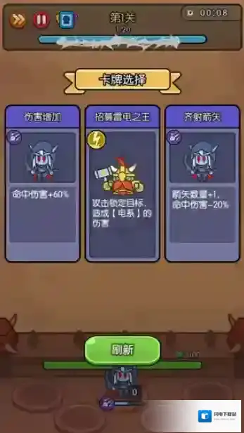 3、每隔一段时间可以选择一次卡牌,卡牌都是技能可以提升角色的战斗力,玩家可以有一定的刷新卡牌的机会。